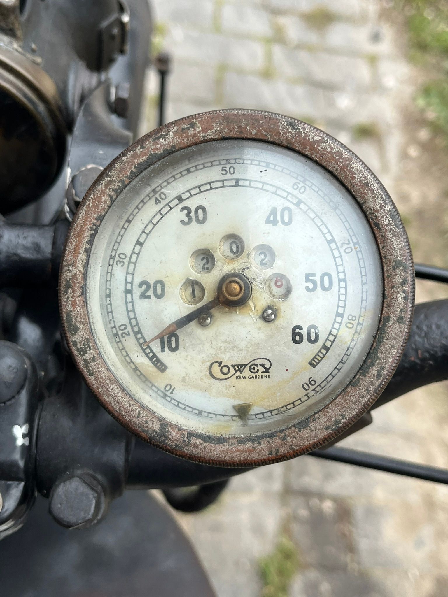 Nice Cowey speedo fitted but not engaged to drive wheel.